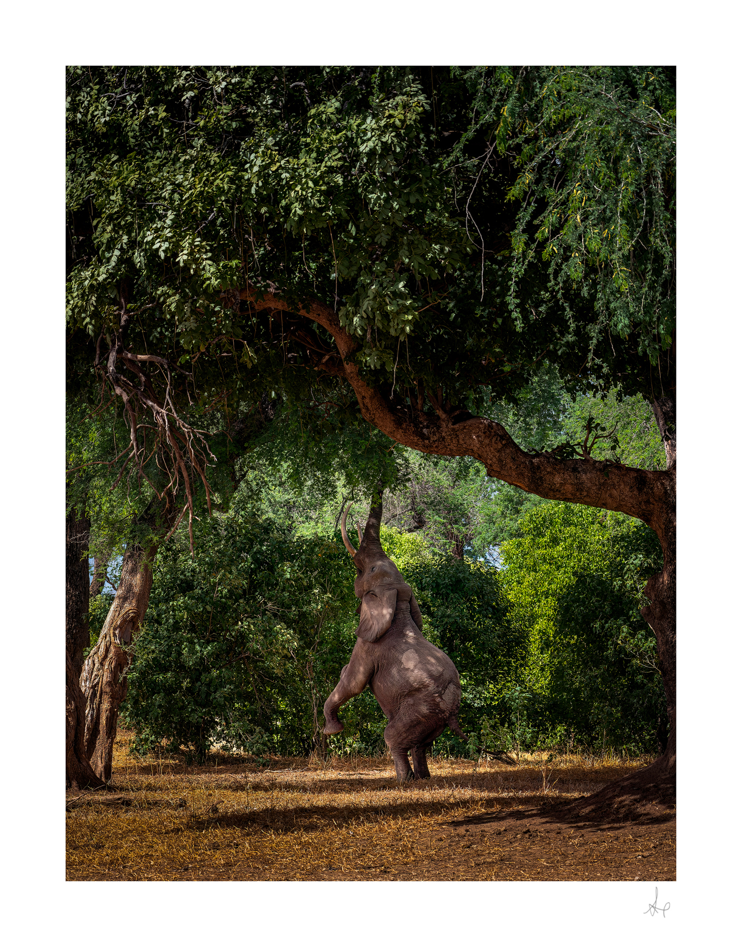 Boswell – mit seinen langen Stoßzähnen auch Big Tusker genannt, ist ein mächtiger, etwa 55 Jahre alter Elefanten Bulle. Er ist berühmt dafür, auf seinen Hinterbeinen zu stehen, um an Nahrung in hohen Baumkronen zu gelangen. Eine außergewöhnlich seltene Szene, die Lucy Gemmill im Mana Pools Nationalpark Simbabwe einfangen konnte.