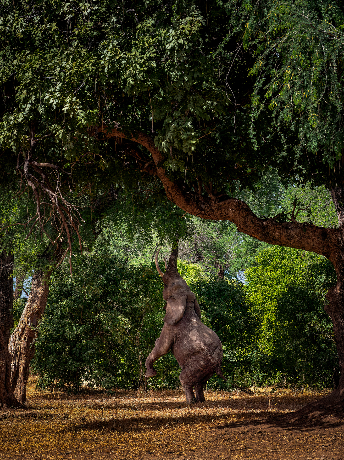 Boswell – mit seinen langen Stoßzähnen auch Big Tusker genannt, ist ein mächtiger, etwa 55 Jahre alter Elefanten Bulle. Er ist berühmt dafür, auf seinen Hinterbeinen zu stehen, um an Nahrung in hohen Baumkronen zu gelangen. Eine außergewöhnlich seltene Szene, die Lucy Gemmill im Mana Pools Nationalpark Simbabwe einfangen konnte.